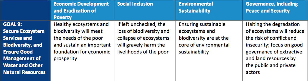Within the proposed Sustainable Development Goals and Targets, Goal 9 is concerned with “securing ecosystem services and biodiversity, and ensuring good management of water, oceans, forest and natural resources”. If pursued effectively, this goal basically requires that “biodiversity, marine and terrestrial ecosystems of local, regional, and global significance are inventoried, managed, and monitored to ensure the continuation of resilient and adaptive life support systems and to support sustainable development”, in accordance with the Aichi Biodiversity targets. At the same time, it implies that “water and other natural resources are managed sustainably and transparently to support inclusive economic and human development”1.